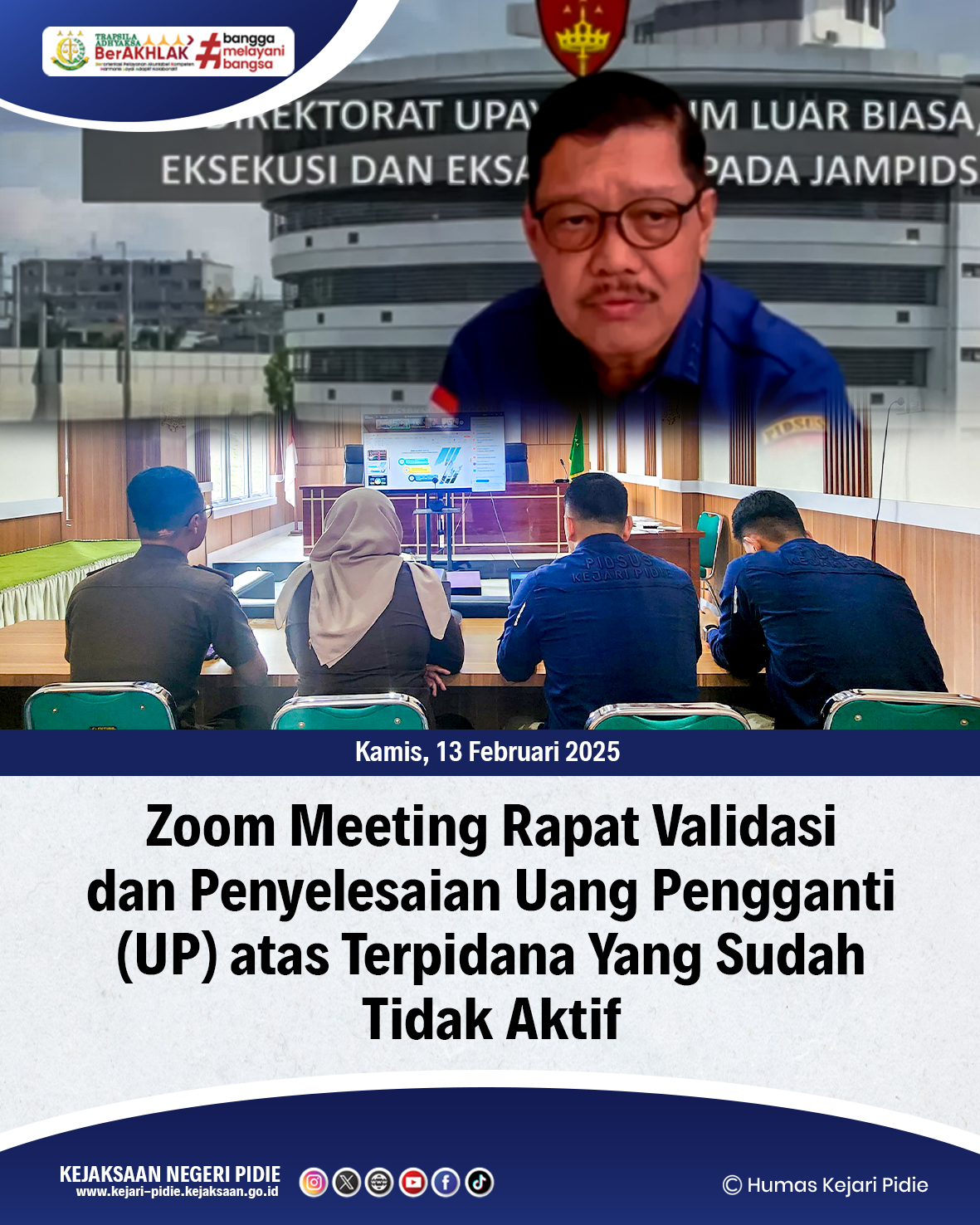 Pada Kamis, 13 Februari 2025, Jaksa Fungsional pada Bidang Tindak Pidana Khusus, Bapak Abrari Rizki Falka, S.H., M.H., bersama dengan Staf Pidsus dan PAPBB menghadiri Zoom Meeting terkait Rapat Validasi dan Penyelesaian Uang Pengganti (UP) atas terpidana yang sudah tidak aktif. Kegiatan ini berlangsung di Aula Kejaksaan Negeri Pidie.