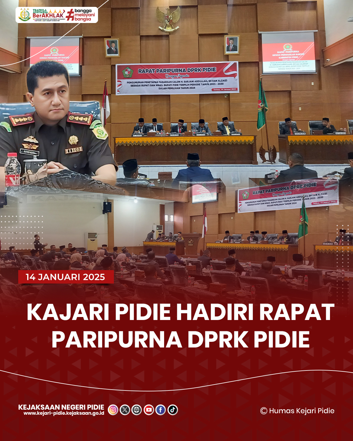 Selasa, 14 Januari 2025 – Kepala Kejaksaan Negeri Pidie, Bapak Suhendra, S.H., bersama unsur Forkopimda Pidie menghadiri Rapat Paripurna DPRK Pidie. Acara tersebut berlangsung di gedung rapat utama DPRK Pidie dan dihadiri oleh berbagai pejabat penting untuk membahas isu-isu strategis dalam pembangunan daerah.
